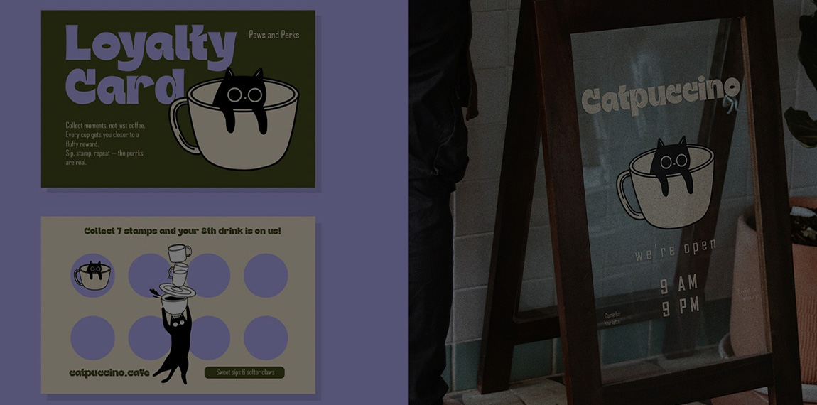 The core identity revolves around “Catpuccino” — a punny marque that blends coffee culture with whimsical cat lore. The logo features a minimalist black cat peeking from a steaming mug in clean line art with hand-drawn charm.